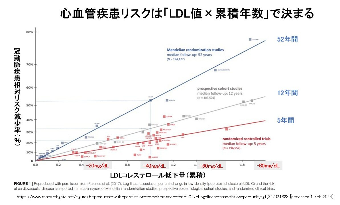 ・LDL値は「下げれば下げるほど」その期間が「長ければ長いほど」冠動脈疾患のリスクが下がる