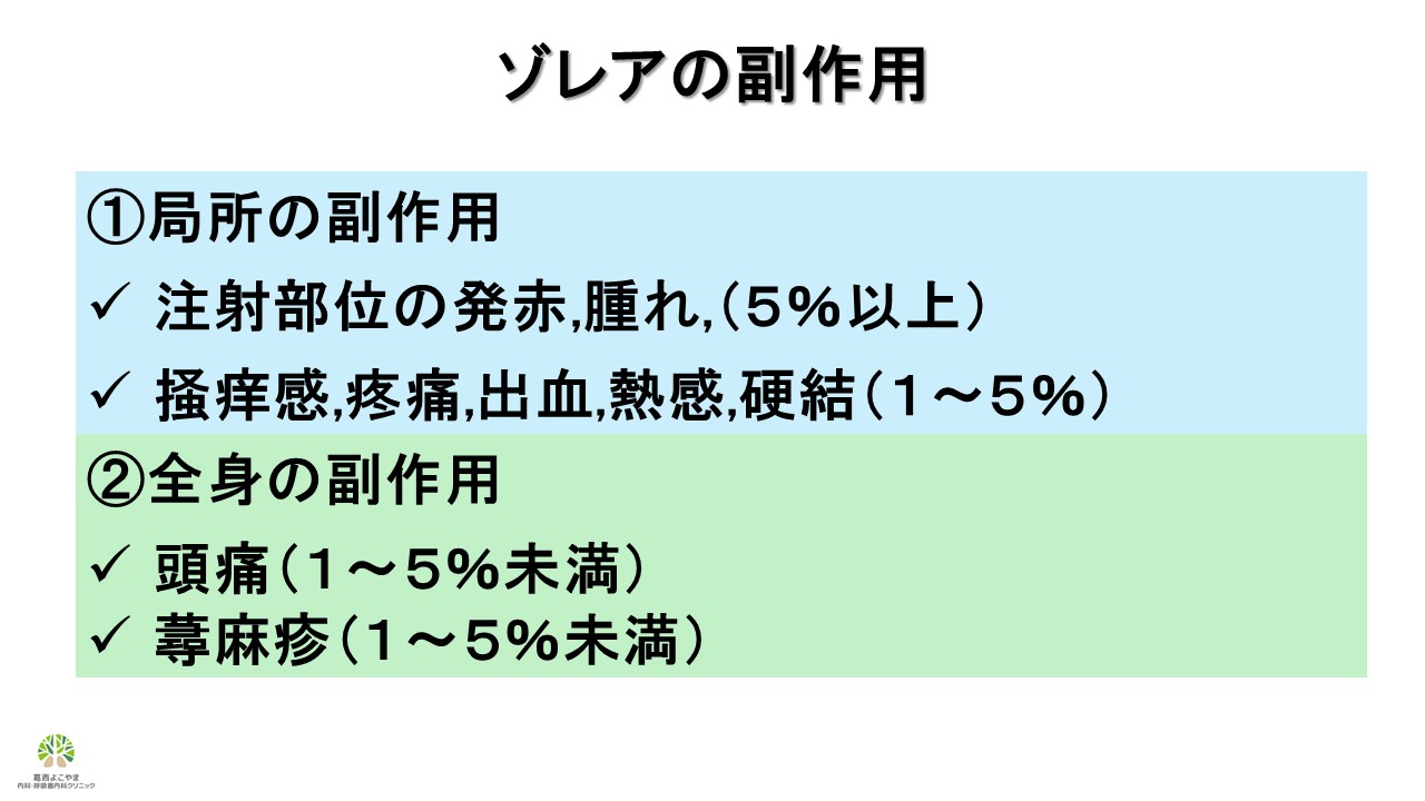 副作用としては皮下注射による局所の副作用とそれ以外の症状がありますが、多くは局所の副作用です。注射部位の発赤や腫れ、痛みなどが多くは注射後1~2日以内に収まります。