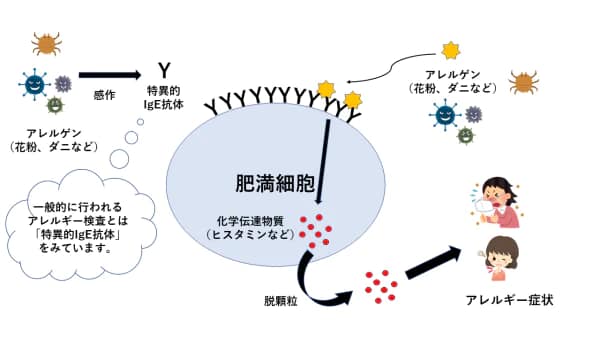 アレルギーには、免疫の中でもIgE抗体という物質が深く関係しています。 特定の物質(アレルゲン)に対してIgE抗体が作られると、 再び同じ物質が体に入ったとき、免疫が過剰反応を起こします。