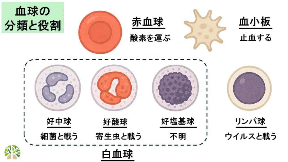 「好酸球(こうさんきゅう)」は白血球の一種で、血液中にある白血球のわずか1〜3%ほどを占めています。白血球には細菌やウイルスをやっつける役割がありますが、その中でも好酸球は主に「寄生虫」や「アレルギー反応」に関わる細胞です。血液中を流れている好酸球は少数派ですが、炎症やアレルギーが起きている場所に集まると、内部にある顆粒(たんぱく質を含む小さな粒)を放出し、体に入ってきた病原体を攻撃します。ところが、花粉やダニなど本来は体に害のない「アレルゲン」まで攻撃してしまうことがあり、それが喘息の原因につながります。