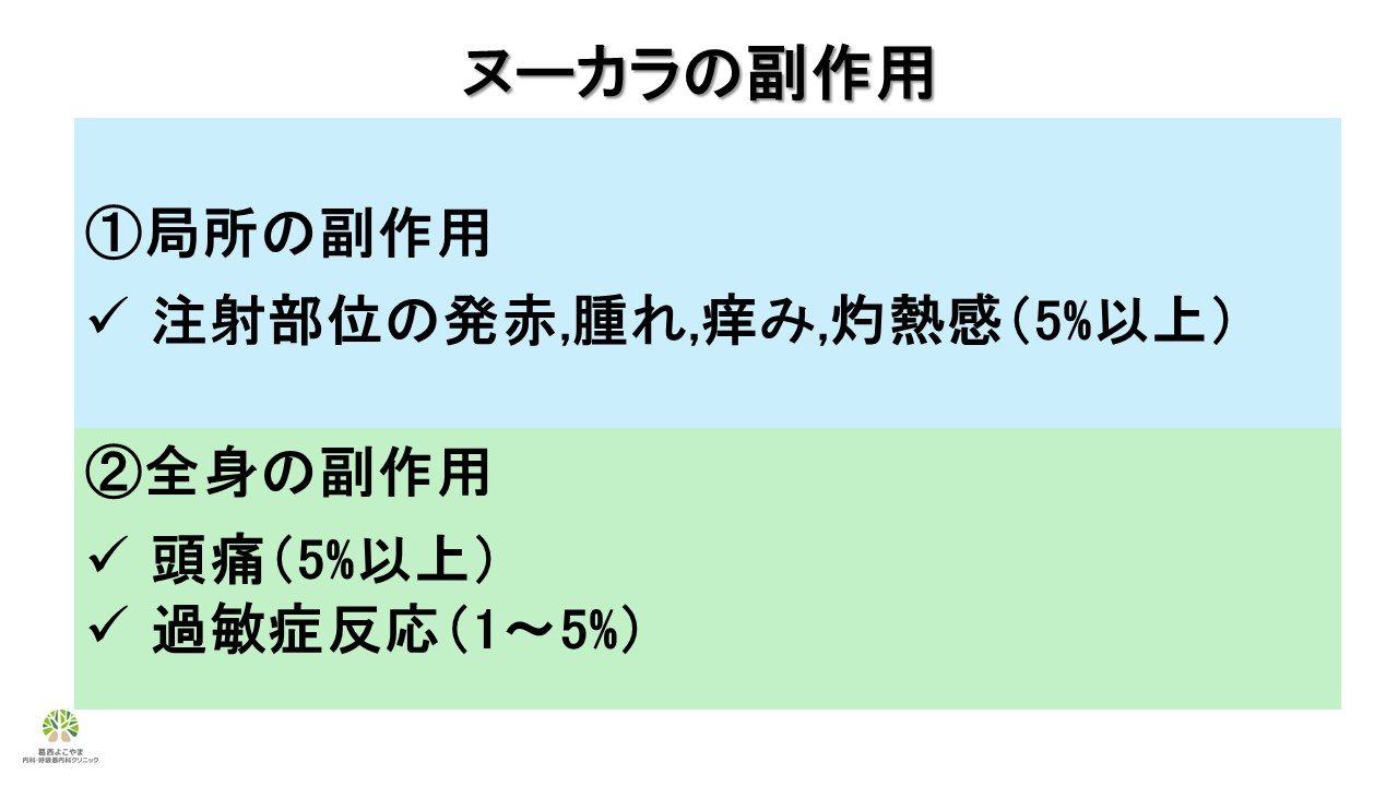 副作用としては皮下注射による局所の副作用とそれ以外の症状がありますが、多くは局所の副作用です。注射部位の発赤や腫れ、痛みなどが多くは注射後1~2日以内に収まります。