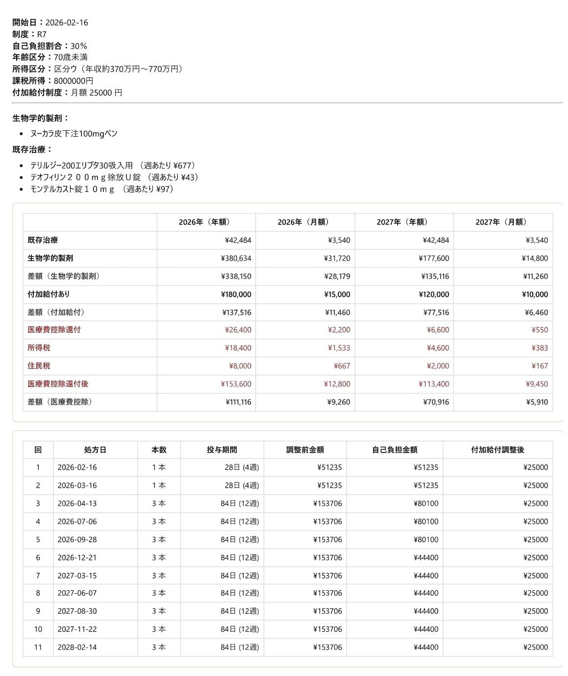 アプリに「所得区分」「年齢」「課税所得」「現在の治療内容」「生物学的製剤」を入力することで、実際にかかる医療費の自己負担金額を算出することが出来ます。