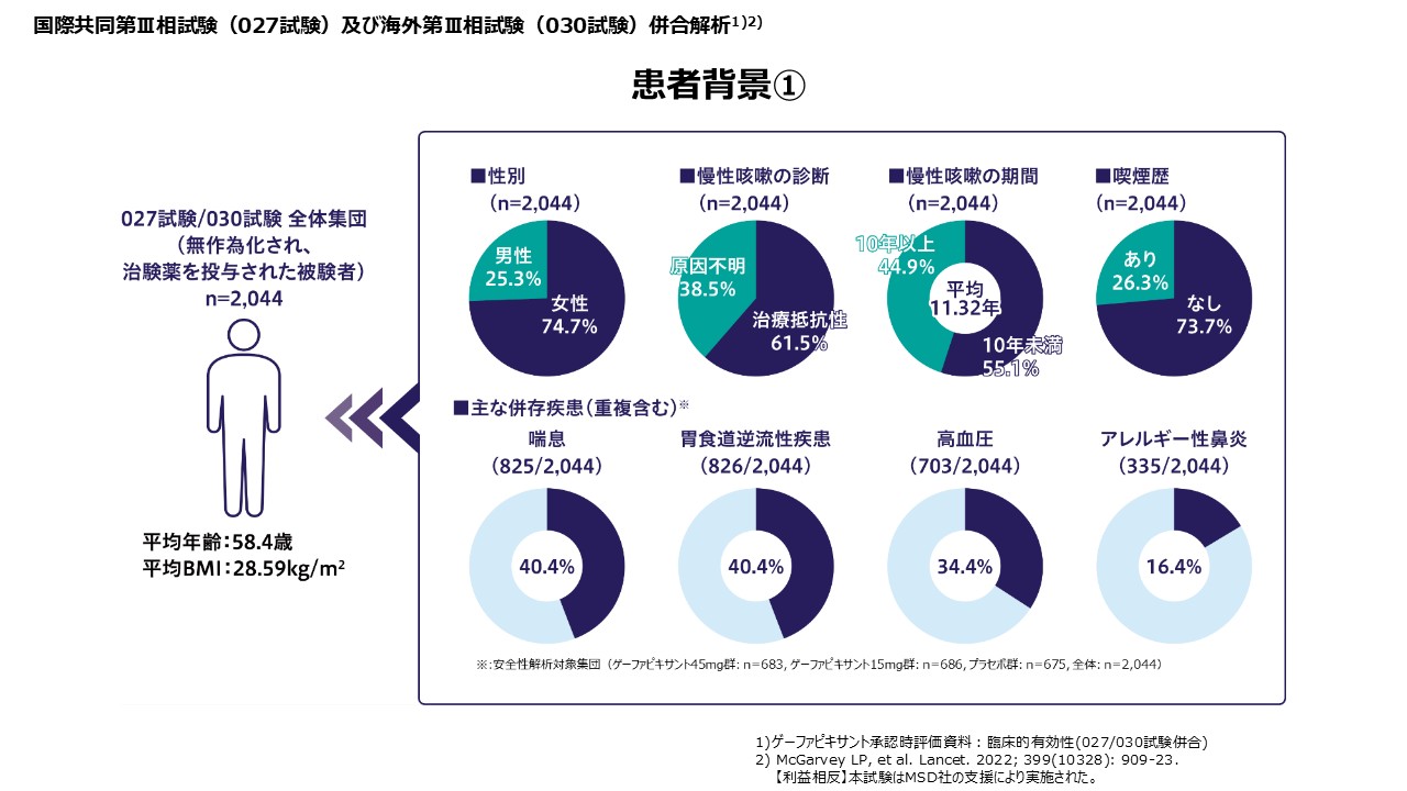 また原因疾患や前治療による治療効果に大きな差はみられませんでした。副次評価項目の1つである「24時間の咳嗽頻度(1時間あたりの回数)がベースラインから30%以上減少した被検者」の割合は58.5%と報告されています。