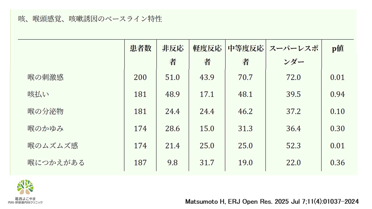 本邦で行われた多施設共同後ろ向き研究の結果をご紹介します。この試験では咳嗽外来を受診し、リフヌアを処方された難治性慢性咳嗽の272例の患者を対象としています。併存症の内訳ですが、咳喘息/喘息が75.3%、胃食道逆流症が49.3%、上気道咳症候群が37.3%、アトピー性咳嗽が28.9%でした。4週間以内のゲファピキサントに対する最大の反応を評価し、有効性は0(全く効果がない)から10(完全に消失した)までのスケールで評価されました。患者の約半数は、0~10のスケールで5以上の反応率を示し、25%がスーパーレスポンダー(反応率8以上)に分類され、スーパーレスポンダーの70.8%と中等度レスポンダーの52.0%が治療開始から2週間以内に反応を示しました。さてこの臨床試験で興味深いのは、奏効率が良い患者さんの特徴にあります。特定の喉頭感覚(喉の刺激感、くすぐったさ、分泌物の感覚)があると、リフヌアの治療反応性と関係があるというものです。また、リフヌアを中止した奏功患者においては、中止後も咳の重症度の改善がそれぞれ中央値で217日と169日間維持されました。筆者らは考察において、リフヌアによって咳の悪循環を断ち切ることで難治性慢性咳嗽の管理と神経可塑性の正常化の促進に役立つ可能性があると述べています。