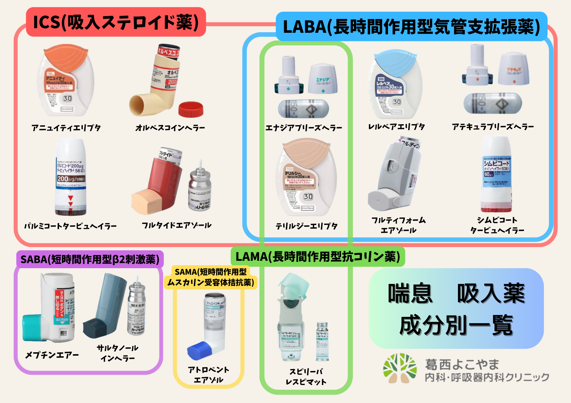 喘息の吸入薬は、大きく分けると役割の違いで「長期管理薬」 と 「発作止め」 に分かれます。