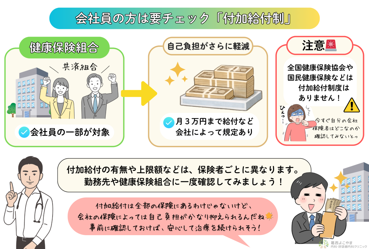 健康保険組合などに加入している場合、 付加給付制度により自己負担がさらに軽減されることがあります。
