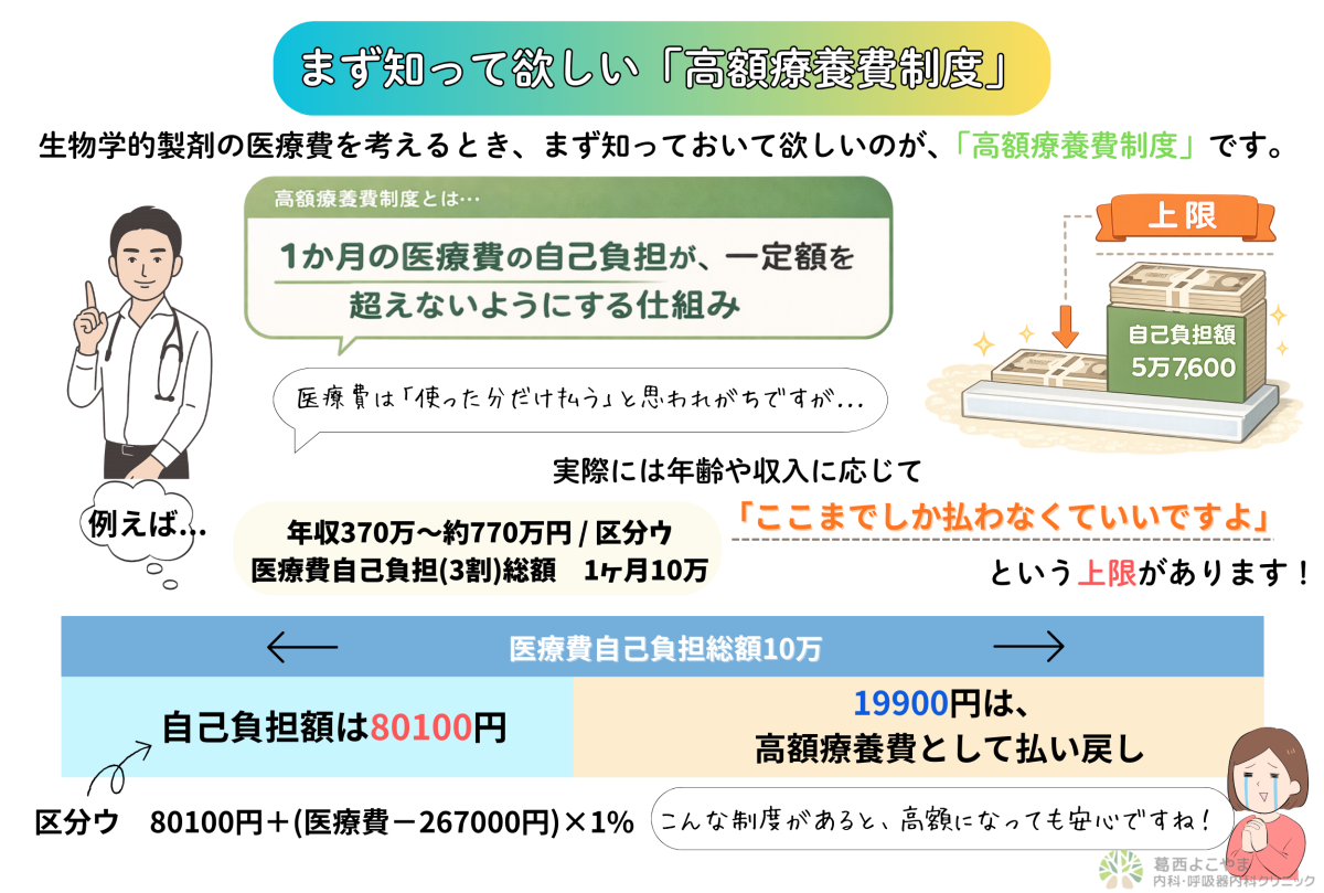 そのため、生物学的製剤のように医療費が何十万円に達する治療でも、 自己負担は一定額で止まる仕組みになっています。