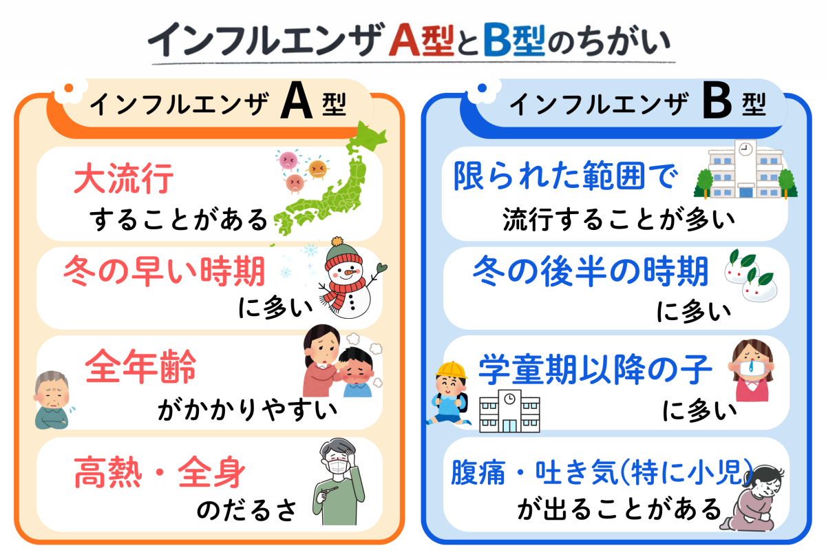 A型・B型はいずれも同じ「インフルエンザ」であり、型にかかわらず注意が必要な感染症です。
