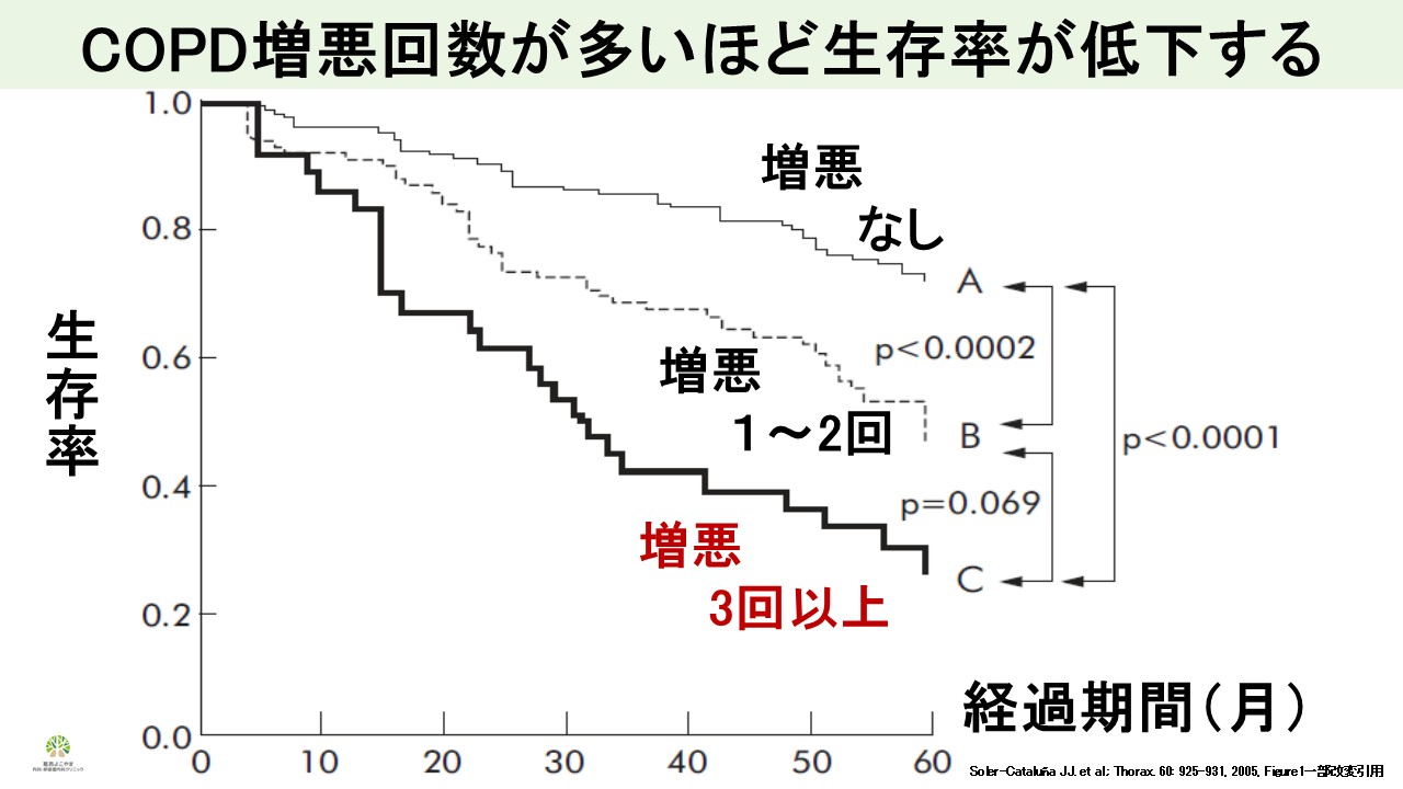 重症増悪(とくに入院を要する増悪)は独立して死亡リスクを高め、増悪頻度が多いほど死亡が増えることが示されている。8