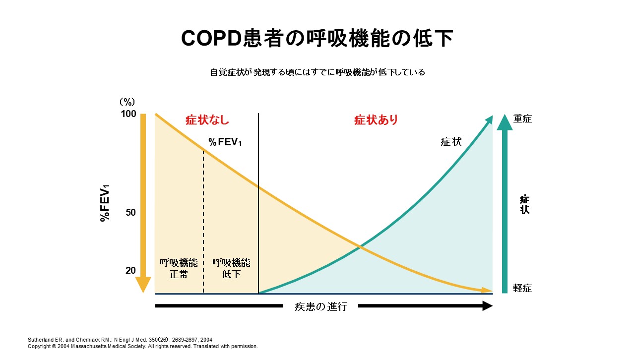 COPDでは症状が顕在化する頃には呼吸機能が相当に低下していることが多く、症状のみを頼りにすると診断が遅れうる。9
