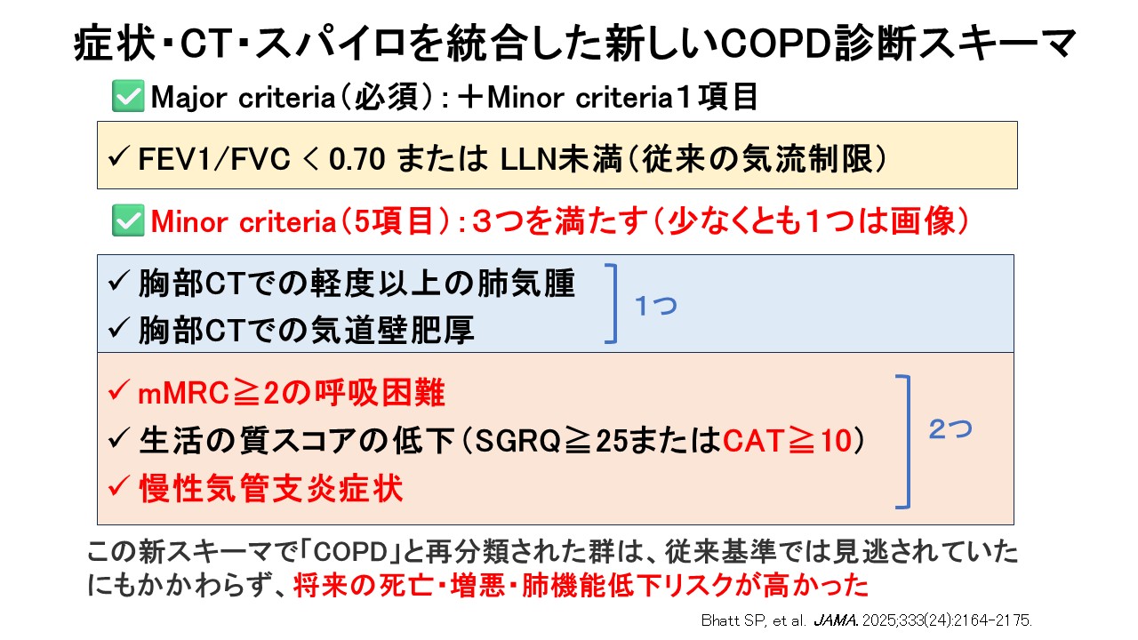 近年、従来の「スパイロ単独」診断では拾いきれないリスク群(症状/CT異常を持つが従来基準では非COPD)を捉えるため、 症状・QOL・画像所見・スパイロを統合した新しいCOPD診断スキーマが提唱された。10