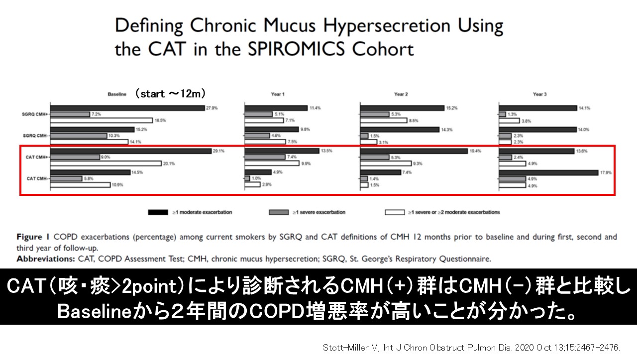 さらにSPIROMICSの解析では、CAT質問票の「咳」と「痰」がともに2点以上の場合、 CMH(慢性喀痰過分泌)の定義として感度・特異度が良好で、CMH(+)群は増悪率が高いことが示された。12