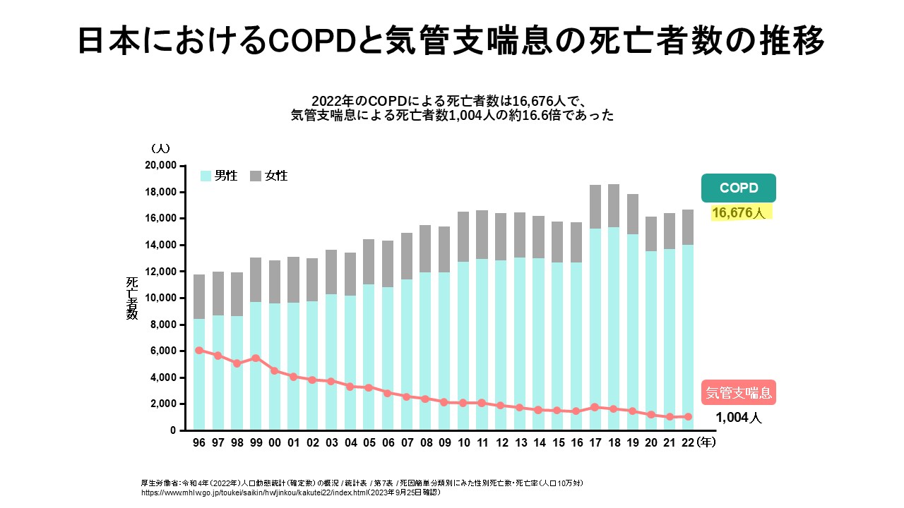 健康日本21(第三次)の資料では、人口動態統計(確定数)を用いた現状値として、COPD死亡率は2021年で人口10万対13.3と整理されている。6 COPDは依然として主要な死亡原因であり、プライマリケア医が早期診断・増悪予防を担う意義は大きい。