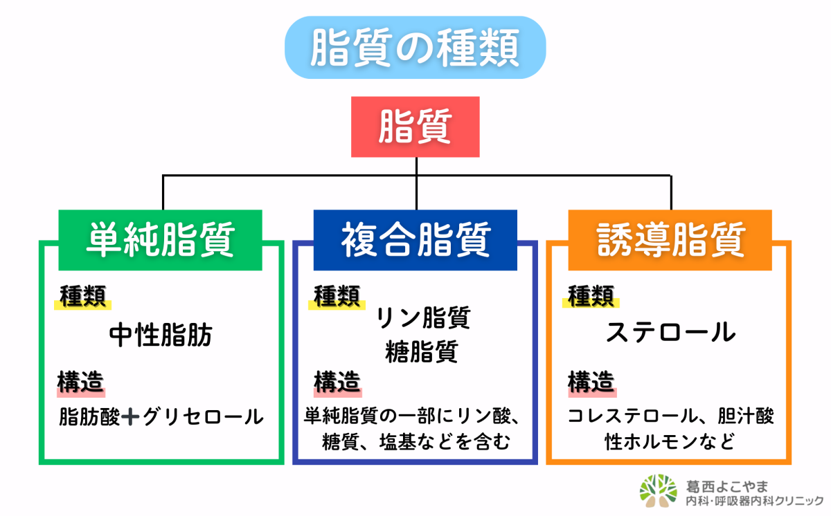 脂質は化学構造の違いによって、大きく3種類に分類されます。