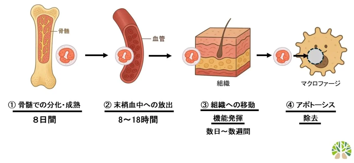 好酸球は骨髄という場所でつくられ、約1週間ほどかけて成熟します。その後、血液中に放出されますが、血液の中で生きていられるのは8〜18時間程度と非常に短いのが特徴です。