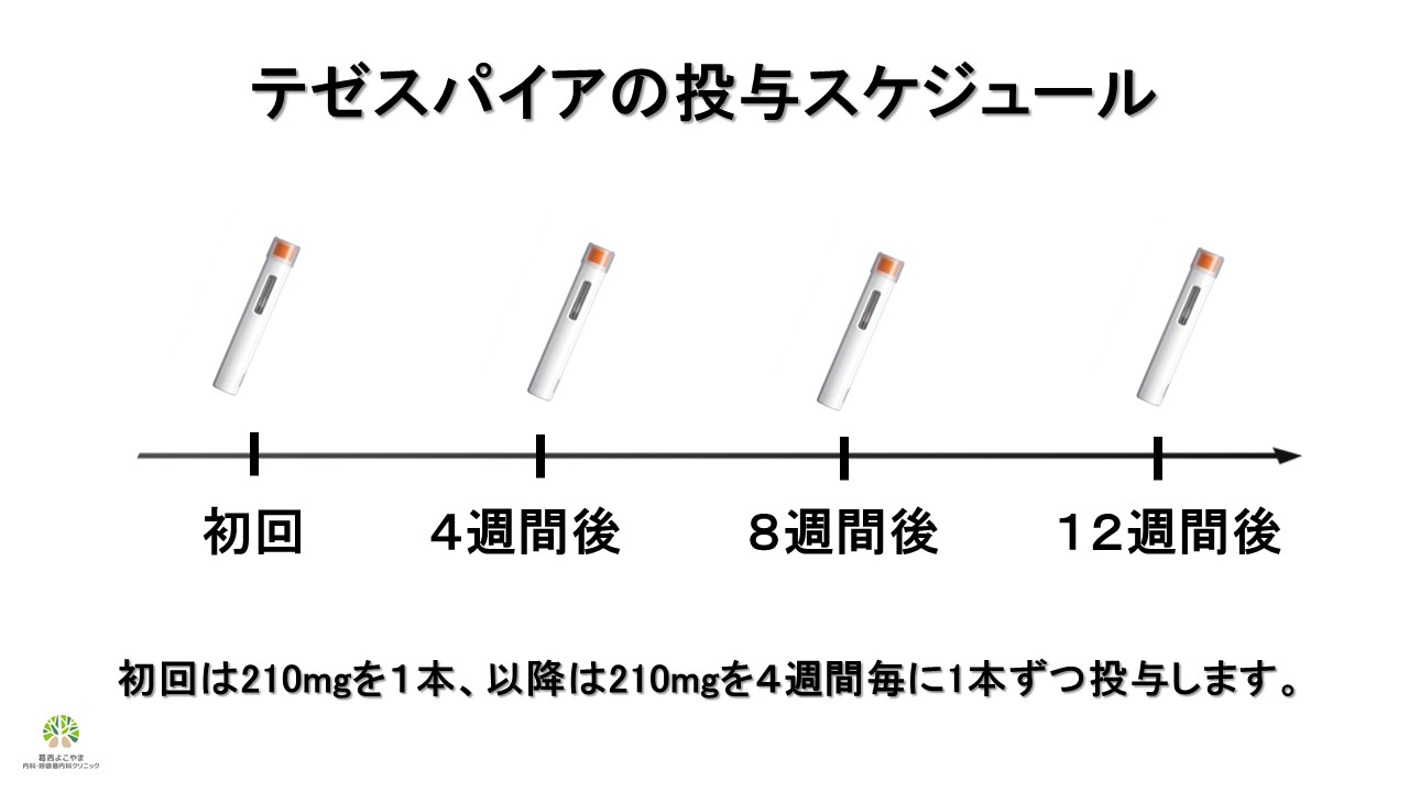 テゼスパイアは皮下注射で投与します。初回は医療機関で実施し、その後4週間毎に医療機関もしくは自己注射によって、自宅で注射を続けていきます。
