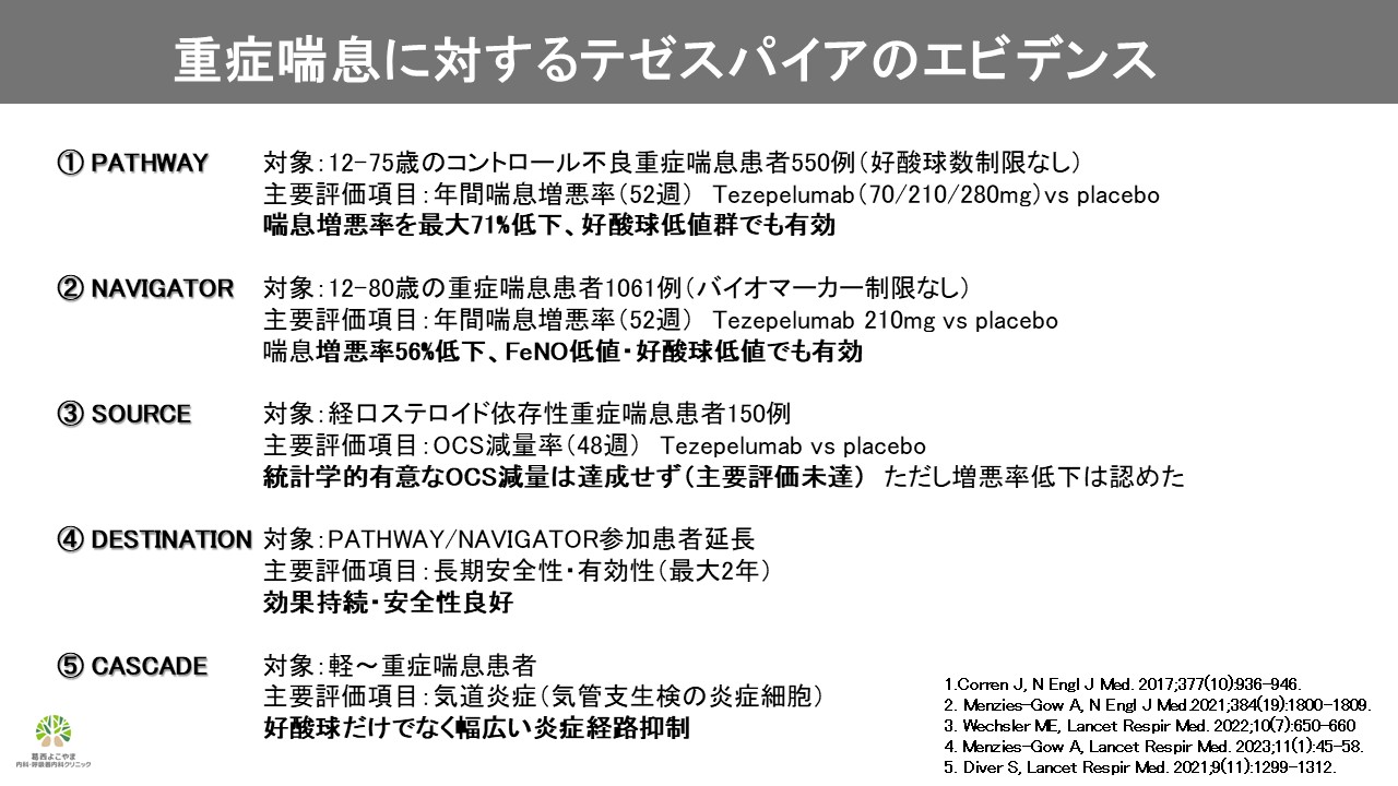 喘息のガイドラインでは、喘息のアレルギーのタイプである「バイオマーカー」によって推奨される生物学的製剤を変えるべきだとされています。テゼスパイアは「好酸球」や「FeNO」の値によらず適応があります。そして他剤との違いは「好酸球」や「FeNO」が低値である「非2型炎症」に対しても使用されることです。