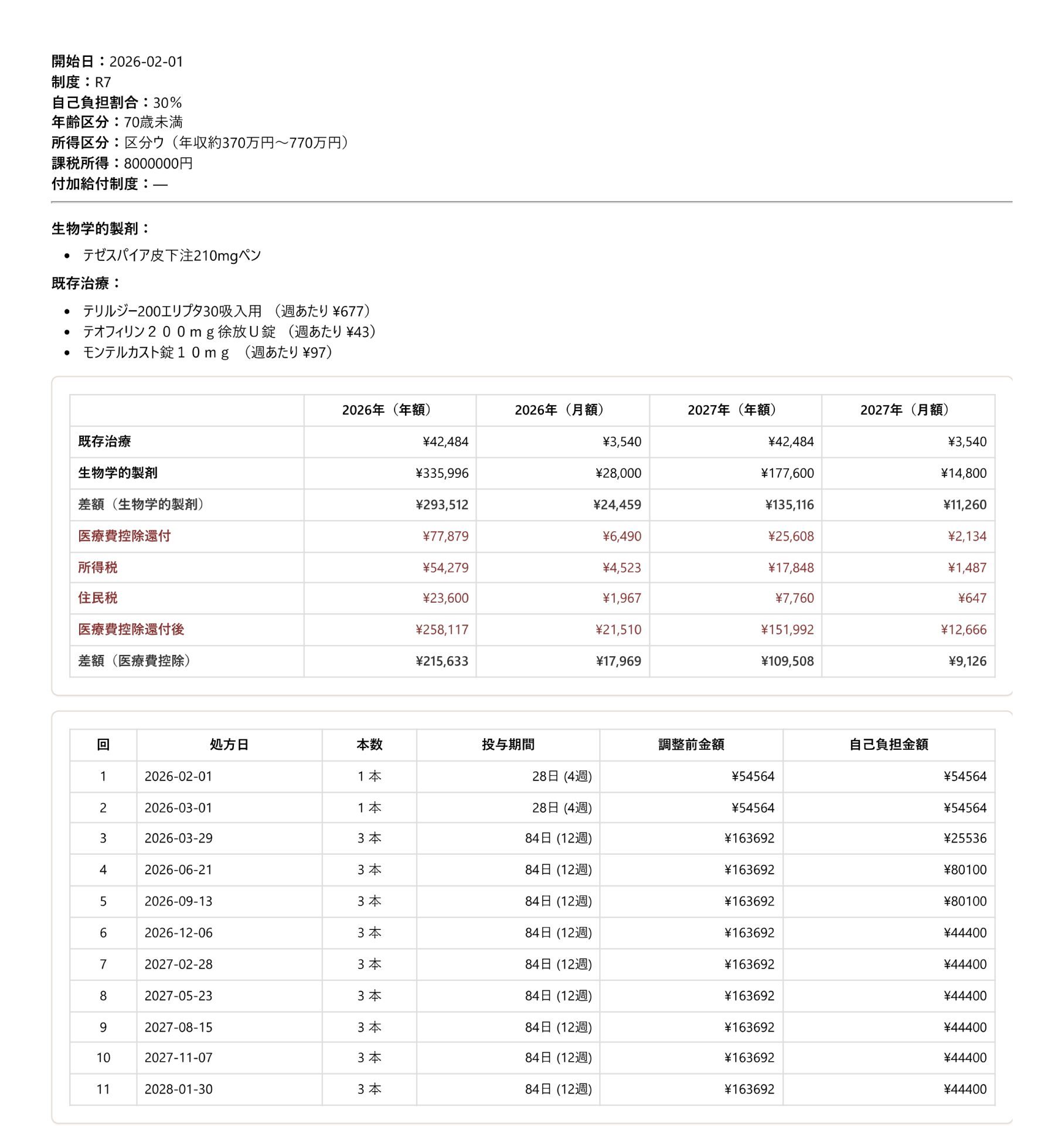 アプリに「所得区分」「年齢」「課税所得」「現在の治療内容」「生物学的製剤」を入力することで、実際にかかる医療費の自己負担金額を算出することが出来ます。