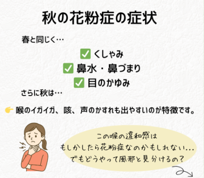 さらに秋は、花粉が鼻や目だけでなく喉頭(声帯の周囲)にも影響しやすく、 喉のイガイガ・乾いた咳・声のかすれが目立つのが特徴です。 当院では、これらの症状を季節性喉頭アレルギーとして診療することがあります。