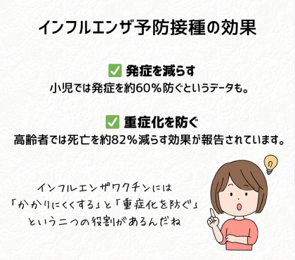 インフルエンザワクチンには「感染を予防する効果」だけでなく、「かかったときに重症化を防ぐ効果」もあります。そのため、発症予防と重症化予防の両面から大切な役割を果たしています。