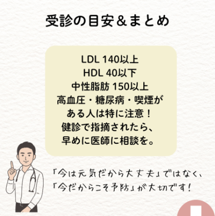 ※ 数値だけでなく、年齢・喫煙・血圧・糖代謝・家族歴などを合わせて総合的に評価します。健診結果は放置せず、早めに生活を見直しましょう。