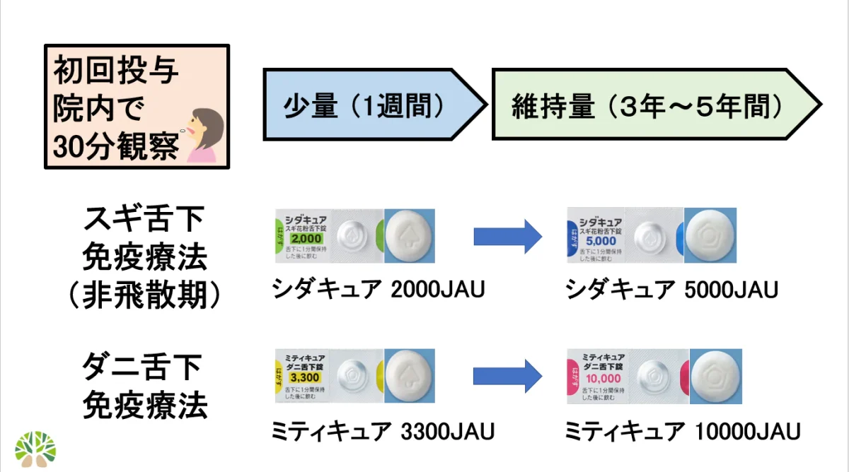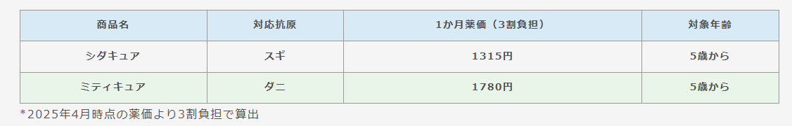 費用(3割負担・薬代の目安):スギ約1,300円/月、ダニ約1,800円/月。 (診察・検査は別途)